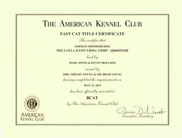 Unfortunately, we retired Mei in 2024 due to her failing her elbow portion of her health testing and the progression of her DJD diagnosis. While she is still able and active, we will continue to be involved in her favorite sport, Fast CAT, and see what else we can get into with her! Mei will remain here with us as she is my (Shelby's) heart dog and the best dog auntie we could ever ask for.